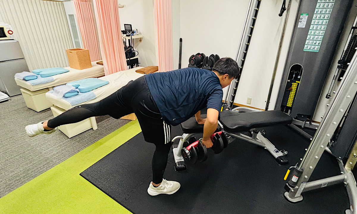 口にするのは簡単な言葉でも、そこに向かって体を作り続ける姿勢は本物です。ワンハンドダンベルロウイングで背筋・体幹をしっかり鍛え、投げる力・打つ力の土台を着実に積み上げています。