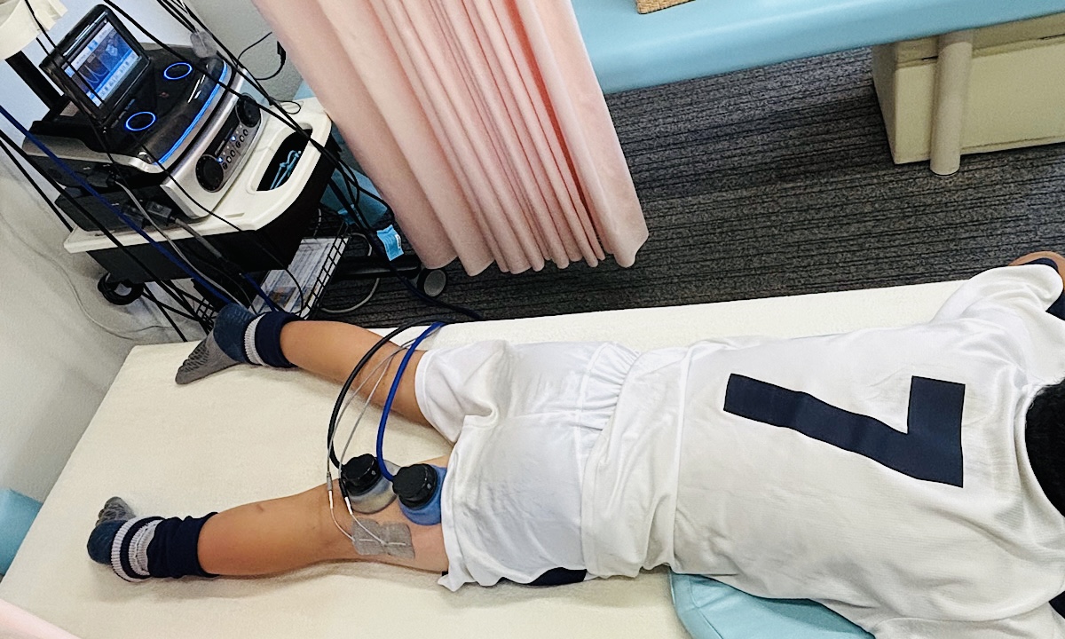 患部に超音波治療を施し、痛みを軽減させる為のハイボルト治療、組織の回復を促進するマイクロカレント治療(微弱電流治療)を施しました。