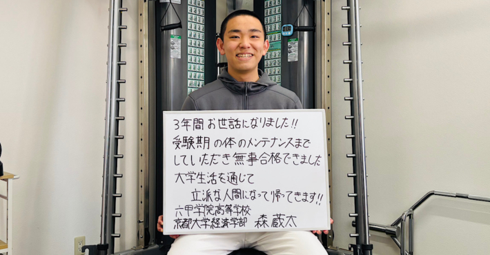京都大学合格! 2026年3月13日 当院でコンディショニングを担当させて頂いていました森蔵太君が京都大学に合格しました!高校ではサッカーに打ち込み、3年時には体育祭で副委員長を務め、「総行進」を大成功させました。引退してからは受験勉強に集中し、誰もが知...